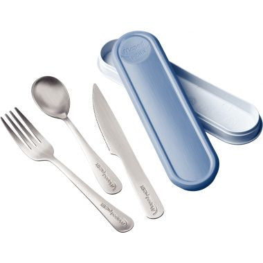 Boîte avec couverts PICNIK bleu. Set fourchette, couteau, petite cuillère. En acier inoxydable.
