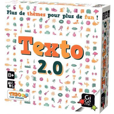 Texto 2.0 est un jeu de cartes éducatif destiné aux enfants à partir de 8 ans. La boîte de jeu contient 60 cartes imprimées recto-verso de 9x9cm. Le principe du jeu est simple : à chaque tour, une carte est retournée pour révéler une lettre et une catégorie. Les joueurs doivent alors trouver un mot correspondant à ces deux critères. Le premier joueur qui trouve un mot remporte la carte. Le jeu se poursuit ainsi jusqu'à ce que toutes les cartes aient été remportées.